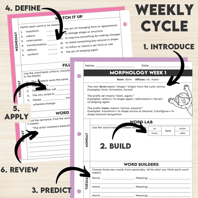 • 40 weeks of daily morphology practice (Monday through Friday activities) designed to teach, reinforce, and spiral key prefixes, roots, and suffixes